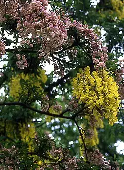 + Laburnocytisus 'Adamii' (also known as Adam's laburnum or broom laburnum) is a horticultural curiosity; a small tree which is a graft-chimaera between two species, a laburnum, Laburnum anagyroides, and a broom, Chamaecytisus purpureus (syn. Cytisus purpureus), which bears some shoots typical of the one species, some of the other, and some which are a peculiar mixture of both "parents". The plus sign (+) indicates the generic name is made for a graft-chimaera. The plant can also be described by the formula Laburnum anagyroides + Chamaecytisus purpureus.