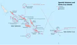 Despite Mendaña's confidence that the Solomon Islands were nearby, it was not until 8 September that they sighted land again, this time the island of Nendo, which they named "Santa Cruz".[10] The Santa Ysabel had disappeared, however, and despite searches by the two smaller vessels, it could not be found.[11] Arriving at what is now Graciosa Bay, a settlement was commenced. Relations with local islanders and their chief Malope started well, with food provided and assistance in constructing buildings. However, morale amongst the Spanish was low and sickness (speculated to be either malaria or scrub typhus)[12] was rife. Manrique was murdered at the orders of, and in front of Mendaña, and shortly afterwards, Malope was killed by soldiers. Relations with the Islanders soon worsened.