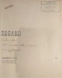The anarchist later returned to Saint-Denis, where he settled and worked as a car painter. He was arrested multiple times for his anarchist activities and his mugshot were taken according to the Bertillon method.[2] He was then sent for his military service, where he was closely monitored before being sent away and judged "unfit" to serve in November 1897.[1][2] A few months later, in February 1898, Segard was arrested in Amiens with other anarchist companions for fighting with Catholics during one of their conferences. He was sentenced to twenty days in prison along with three other companions.[1][2]