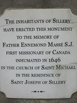 A year later, Massé was appointed vice-rector of the Royal College at La Flèche. In 1625, he again set sail for Quebec, and built the first Jesuit house at Notre-Dame-des-Anges, Quebec. He remained there until the Surrender of Quebec of 1629 when the French clergy returned to France. He returned a third time in 1633 with Samuel de Champlain and Jean de Brébeuf. As he was in advanced in age, he lived mostly at Sillery, which he built as a reservation for the converts.[1] He died at Sillery, and a monument was erected to his honour at this place on the site of the old Jesuit Church which stood on the bank of the Saint Lawrence River, a short distance above Quebec City.