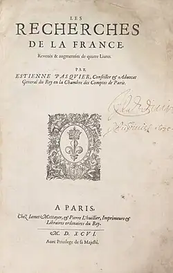 • Huppert, George, The Idea of Perfect History: Historical Erudition and Historical Philosophy in Renaissance France. (Urbana: University of Illinois Press, 1970) - See the chapter on Pasquier p28-71.