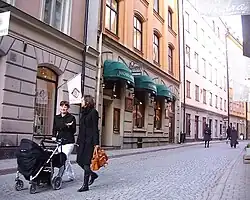 Many taverns from the 17th century are known in the street: Riga on Number 19; Holländska Dyn ("Dutch Slough") on Number 21; Förgylda Draken ("Gilded Dragon") on Number 27; Tre Kungar ("Three Kings") on Number 28; Sveriges Wapen ("Swedish Arms") on Number 29; and Stjärnan ("The Star") in the Rococo building on Number 45. Of all these taverns, only Den Gyldene Freden ("The Golden Peace") on Number 51 remains, but can hardly give a hint of the filth, stench, rows, and misery once hidden behind the romantic names.[2]