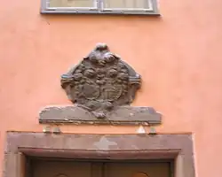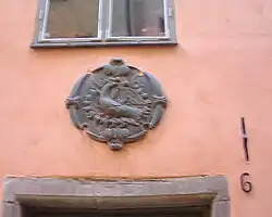 On Number 6-8 is the House of Banér, the major portal of which is on the opposite side, facing Bollhusgränd, while the 'modest' portal on this side carries the arm of Per Banér and Hebbla Fleming. On the façade is also the fire bird Phoenix taking off surrounded by flames, the symbol of the fire insurance company created to tackle the fires frequently ravaging the old town, owned by its customers and still residing on Mynttorget.[5] The cartouches are from the 17th century, while the portals and remaining façade is from the 18th century.[6] Number 10-12 were merged in the 1760s when the top of the building was added and the building got much of its present appearance, save for the enlarged shop windows and some original decorations now gone.[7]