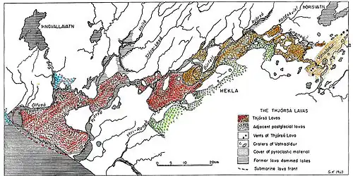 The Great Þjórsá Lava (Icelandic: Þjórsárhraunið mikla [ˈθjour̥sˌaur̥ˌr̥œyːnɪð ˈmɪhkla]) is the largest lava flow in Iceland (by both area and volume) and the largest lava flow[1] that is known to have erupted in a single eruption in the Holocene. Þjórsá Lava has a total volume of more than 25 km3 (6.0 cu mi),[2] covering approximately 900 km2 (350 sq mi).[3][4] The Þjórsá Lava does not appear on the surface until 70 km (43 mi) downstream of its identified eruptive area.[3]