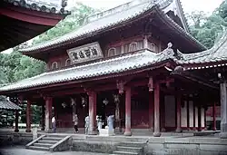 Construction was completed in 1669, the architecture done in the Chinese Ming dynasty style. By authorization of the local bakufu leaders (i.e. Tokugawa Tsunayoshi[4]), the Ōbaku-shu emerged to help revitalize Rinzai practice in Japan. The practice at Manpuku-ji was different from that in other Rinzai temples and monasteries of Japan during this period, being much more Chinese in its approach. Yinyuan brought with him aspects of esoteric Buddhism and Pure Land Buddhism. As Heinrich Dumoulin puts it, "For Zen practice in general, seated meditation and the practice of kōan are central, while cultic ceremony is of secondary importance. Insofar as the Ōbaku belonged to the Rinzai tradition, zazen and kōan practice were made part of daily life, but ritual was also accorded a place of considerable importance."[2] Furthermore, Ōbaku monasteries and temples came to be governed by a doctrine known as Ōbaku shingi, which both imported Chinese practices such as the recitation (dharani) of nembutsu and "sought to preserve the Chinese character of the group."[3] The Ōbaku also chanted sutras derived from the Pure Land Buddhist sect set to Chinese music.[2]