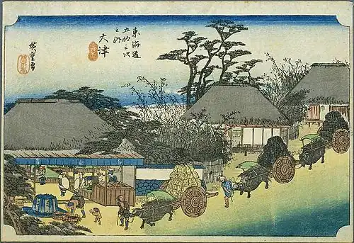 Utagawa Hiroshige's ukiyo-e print of Ōtsu-juku dates from 1835–1838. The print depicts the main street of Ōtsu-juku, Hacho-dori, which slopes down to Lake Biwa. Heavily-laden oxcarts are ascending the street, which draw the attention of three traveling women heading in the opposite direction. The opened-fronted shop of the left contains a kago (palanquin), with two bearers in front, hoping for customers. The shops on both sides of the street have signs with various letters or symbols representing Hiroshige and/or his publisher. Overhead, migrating flocks of birds indicate that the scene is set in autumn.