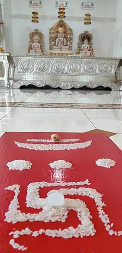 Aṅga Pūjā (Worshipping by anointing various parts of the idol): Such worshipping is performed by anointing various parts of the idol using several objects of worship, including water, saffron mixed with sandalwood paste,[50]Vāsakṣepa (sandalwood powder), Yakṣakardama (a fragrant ointment) etc. According to scriptures, such worshipping is performed only using 'uttam dravya' (excellent and possibly expensive objects of worship).A Śvetāmbara lay follower performing 'Anga Puja' of the idol of Kesariyaji by anointing the idol with saffron and sandalwood mixture as per ancient rituals of Kesariyaji temple and of the Śvetāmbara sectMendicants are not allowed to perform worshipping using such objects as they do not own materialistic objects and have already renounced them. Also the violence that can be caused towards small creatures and beings during such worshipping is unacceptable according to a mendicant's conduct as described in the scriptures. Householders are not supposed to follow such micro levels of non-violence and must perform idol worship as it has more merits (extolling qualities of tirthankaras and eventually attaining such a state) than demerits as described in the canon. Another form of such worship is Aṅga Rachanā or Āṅgī, which refers to the devotional worshipping of the idol by decorating it with a devotedly designed armor of vibrant objects such as stones, clothes, and other colorful objects that are obtained by pure methods and sources.[51]Anga Rachana of an idol of Mahavira Swami, the 24th Tirthankara, using pure and non-violently prepared silver and gold foil. at Shri Mahavira Swami Jinalaya at Risala Bazar, DeesaAnga Rachana (decoration of Tirthankara idols with pure materials) using only pure flowers at Vasupujya Swami Derasar, Goregaon, Mumbai
