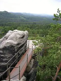Šaunštejn Castle (German: Schauenstein, also Hohenleipaer Raubschloss) is a rock castle near Vysoká Lípa (Hohenleipa) in the Bohemian Switzerland in the Czech Republic. Today only a few ruins remain of the original castle. Preserved are the foundations of the wooden superstructure, several rooms that were chiselled-out of the rock and the cistern.