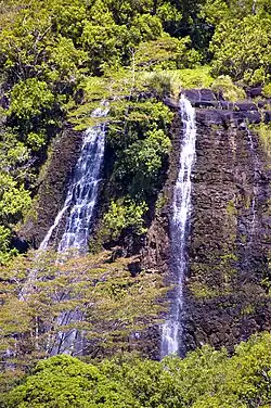 ʻŌpaekaʻa Falls is a waterfall located on the ʻŌpaekaʻa Stream in Wailua River State Park on the eastern side of the Hawaiian island of Kauai. It is a 151-foot (46 m) waterfall that flows over basalt from volcanic eruptions millions of years ago. Below the ridge down into the ravine through which the water falls can be seen the vertical dikes of basalt that cut through the horizontal Koloa lava flows.[1] The name "ʻŌpaekaʻa" means rolling shrimp, "ʻopae" being Hawaiian for "shrimp," and "kaʻa" for "rolling". The name dates back to days when the native freshwater shrimp Atyoida bisulcata were plentiful in the stream and were seen rolling and tumbling down the falls and into the churning waters at the fall's base.[2][3]