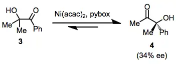 Although examples of enantioselective α-ketol rearrangements starting from achiral α-hydroxy ketones are fairly limited, a number of examples of 1,2-asymmetric induction (due to stereoelectronic factors) have been observed. In one example of an enantioselective process, use of nickel(II) diacetoacetonate and pybox provided 4 in 34% ee.[11]