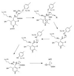 The structure of ACS has been largely determined via X-ray crystallography.[7] Conservation of the residues in ACS's catalytic domain and sequence homology suggest that ACS catalyzes the synthesis of ACC in a similar fashion as other enzymes that require PLP as a cofactor. However, unlike many other PLP-dependent enzymes, Lys (278) is not the only residue that interacts with the substrate. The proximity of the electronegative oxygen from Tyr (152) to the C-γ-S bond suggests a crucial role in the formation of ACC.[7] X-ray crystallography with aminoethoxyvinylglycine (AVG) a competitive inhibitor confirmed Tyrosine's role in the γ elimination.[11]