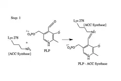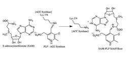 • Note inhibitors AVG and AMA bind PLP to form a ketimine and oxime respectively (whose reverse reactions are much less favorable) and prevent the ACC synthase catalyzed reaction with SAM.[3][6]