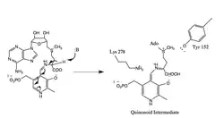 Like other PLP dependent enzymes, it catalyzes the reaction through a quinonoid zwitterion intermediate and uses cofactor pyridoxal phosphate (PLP, the active form of vitamin B6) for stabilization.[1][2][3]