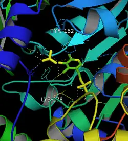The main functional groups in the catalytic domains are the Nitrogen from the Lys 278 residue and the Oxygen from the Tyrosine 152 residue.