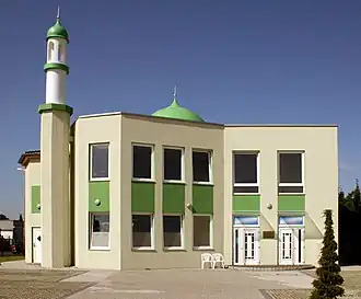 "Mosque of good news“, foundation Oct 1999, completed Mar 2002, plot 2481 m2, prayer hall 129 m2, two minarets 10 m height[3] 52°18′2.3″N 8°0′18.3″E / 52.300639°N 8.005083°E / 52.300639; 8.005083 (Basharat Mosque)[M 5]