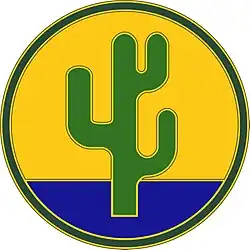 On a yellow disc 2+12 inches (6.4 cm) in diameter, a blue horizontal base, overall a green giant cactus, all with a 18 inch (0.32 cm) Army green border. The cactus represents the home area of the unit in the Southwest when it was first organized and is symbolic of the unit's nickname.