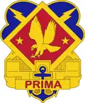 Insignia: A gold color metal and enamel device 1 3/16 inches (3.02 cm) in height overall consisting of a blue cloud bank supporting two gold crossed lightning flashes, surmounted by a red diamond shape with a gold border and bearing a gold swooping hawk with wings displayed between two gold stars, in base in front of the diamond's lower point a gold wall with three merlons charged at center with a blue anchor extending above and below a gold scroll inscribed "PRIMA" in red letters. The two stars symbolize the unit's participation in World War II and the Korean War. The Philippine Presidential Unit Citation and the two Republic of Korea Presidential Unit Citations are represented by the three merlons of the wall. The swooping gold hawk refers to the firepower of the unit. The battlement with the anchor alludes to the unit's overseas service and its historical background. The flashes symbolize the speed and efficiency of the unit while "X" suggests the numerical designation of the unit. The distinctive unit insignia was originally approved for the 10th Artillery Group on 10 November 1969. It was amended to correct the description on 1 December 1969. It was redesignated for the 10th Air Defense Artillery Group on 5 April 1972. It was redesignated for the 10th Air Defense Artillery Brigade on 2 June 1983. The insignia was redesignated for the 10th Army Air and Missile Defense Command with the description updated effective 17 October 2011.[6]