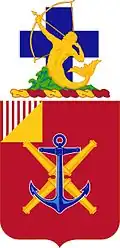 The blue cross indicates the Civil War service of Battery E, 5th Artillery (now Battery E, 10th Coast Artillery).[6][7][8] It served in the 3rd Division, 6th Army Corps during this conflict. The triton with bow and arrow symbolizes danger rising from the sea, against which the Coast Artillery in its forts must guard.