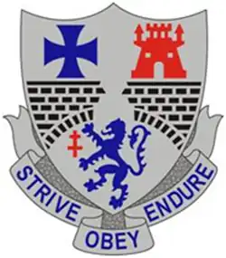 - A Silver color metal and enamel device 1+5⁄32 inches (2.9 cm) in height overall consisting of shield blazoned: argent (silver gray), issuant in fess a bridge of one arch sable masoned of the first, the center portion shot away, in chief a cross patée azure and a Spanish castle gules; in base a lion rampant of the third grasping a cross of Lorraine of the fourth. Attached below and to the sides of the shield a Silver scroll inscribed "STRIVE OBEY ENDURE" in blue letters.