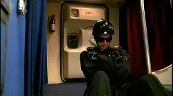 Mandy (Mia Kirshner), a freelance terrorist, moments before exploding a 747. This scene, broadcast two months after the September 11 attacks, delayed the airing of the 24 pilot. This scene was also edited for sensitive content.
