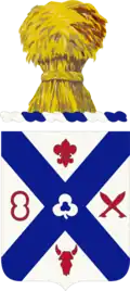 - Shield: The shield is white, the old Infantry colors. The blue saltire is taken from the Confederate flag - for Civil War service. At the battle of Gettysburg the 1st Minnesota Infantry Volunteers were in the 2d Division, 2d Corps (Hancock's), whose badge was the three-leaf clover. The figure "8" represents the Spanish War service and the crossed bolos the Philippine Insurrection service, while the fleur-de-lis represents World War I service of the 135th Infantry. The bull's skull (shoulder sleeve insignia of the 34th Division) indicates service with this division during the period of peace and through World War II.
