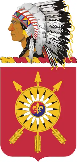 The unit's insignia was approved on 10 May 1972.[2] It is a gold coloured metal and enamel device, 1+3⁄8 inches (3.5 cm) in height. It consists of a coat of arms with a shield, crest and motto. Three arrows symbolize the unit's three assault landings at Sicily, Naples-Foggia and Southern France. The arrows with the buckskin shield also symbolize Oklahoma's Indian heritage, (a depiction of a buckskin shield is found on the state flag of Oklahoma). The sunburst design, a favorite Indian symbol, alludes to the unit's mission to provide general target acquisition, survey and meteorological support to the artillery with a corps. The sixteen stylized rays symbolize the sixteen battle honors of some elements of the organization. The fleur-de-lis represents the unit's service in Europe, World War II. The taeguk alludes to the organization's participation in the Korean War.