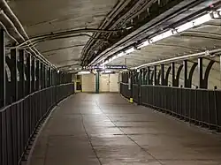 A pedestrian concourse is located above the platforms along the station's entire length, supported from the cemented barrel-vaulted ceiling by steel Y-shaped struts. This concourse connects the two mezzanines at the north and south ends of the station and has four steel-and-concrete stairs to each platform.[5]: 4 There are metal railings along the concourse, from which the platforms can be seen.[61][62][63] The southern mezzanine has a station agent booth and storage rooms.[5]: 5