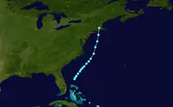 On September 13, a tropical storm was first observed about 225 mi (360 km) southeast of Cape Hatteras, North Carolina.[3] A nearby ship with the call sign Cushnoc reported estimated winds of 60 mph (95 km/h), which was judged to be the peak intensity of the tropical storm. Another ship on September 16 reported similar winds in the same location;[11] Thus, it was estimated to have remained nearly stationary for three days. Its complete track is unknown.[3]