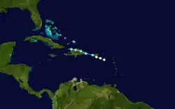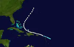 On September 22, a tropical storm was located about 200 mi (320 km) east of Guadeloupe. With a steady west-northwest path, the storm moved across the northern Lesser Antilles on September 23, during which it intensified into a hurricane. It passed a short distance north of Puerto Rico and the Dominican Republic as it reached its peak intensity of 90 mph (150 km). Late on September 26 the hurricane turned northwestward, bringing it through the Turks and Caicos Islands and eastern Bahamas. Recurving north-northeastward, the cyclone moved into open waters, and was last classified as a tropical cyclone on September 30 about 390 mi (630 km) east of Cape Hatteras.[1] However, one hurricane researcher assessed the hurricane as lasting until October 3, with the cyclone turning eastward and dissipating near the Azores.[2]
