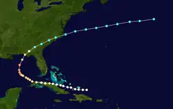 A hurricane formed north of Hispaniola on August 25. It moved westward, passing over the Inagua Islands before striking the north coast of Cuba as a Category 2 hurricane on August 27. The cyclone weakened to Category 1 strength as it crossed the island, close to Matanzas, but regained first Category 2 and then Category 3 strength as it moved north through the Gulf of Mexico. The cyclone made landfall near Panama City, Florida, on August 31 as a Category 2 hurricane. Thereafter, it then quickly weakened to a tropical storm while moving northward through Georgia and South Carolina. The storm entered the Atlantic from the state of Virginia on next day and dissipated on September 3.[3]