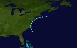 A sixth tropical storm was first observed by the brig Caroline E. Kelly on September 18, which experienced a heavy gale while located about 930 mi (1,495 km) east-southeast of Bermuda.[2] With initial winds of 60 mph (95 km/h), the storm slowly strengthened while moving north-northwestward. At 1200 UTC on September 19, it reached hurricane status and peaked with winds of 80 mph (130 km/h). The storm decelerated and remained at this intensity for over 24 hours. Late on September 21, the system re-curved westward and weakened to a tropical storm.[3] It was last seen by the Pride of the Sea on September 22,[18] while located about 695 mi (1,120 km) south of Cape Race, Newfoundland.[3]