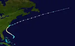 A tropical storm was first observed east of the Bahamas on September 6. It moved slowly northwestward towards the coast of the United States and attained hurricane strength early on September 9. The cyclone continued travelling northwest along the US coast, becoming a Category 2 hurricane whilst off the coast of Georgia on September 11. On September 13 the cyclone made landfall near Wilmington, North Carolina, but then quickly weakened to a tropical storm and turned eastward into the Atlantic on September 14. Throughout September 15, whilst over water, the storm regained hurricane strength and continued northward before becoming extratropical in the mid-Atlantic on September 17.[7]