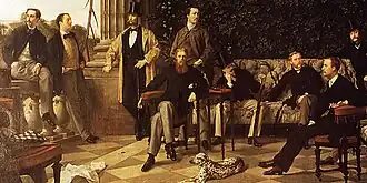 The slightly cutaway morning coat was still worn for formal day occasions. The most formal evening dress remained a dark tail coat and trousers, with a white cravat; this costume was well on its way to crystallizing into the modern "white tie and tails." While during the first half of the decade the waist was long, after 1865 the waist became shorter, with pockets in the pleats.[12]