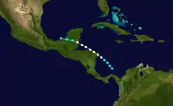 Observations of this storm began as early as July 4 in the southwestern Caribbean Sea,[13] with a ship encountering the cyclone about 130 mi (210 km) north-northeast of Colón, Panama. The system intensified steadily while moving northwestward, becoming a hurricane around 12:00 UTC on the following day. About six hours later, the storm intensified into a Category 2 hurricane and peaked with winds of 100 mph (155 km/h). The hurricane then made landfall near the NicaraguaHonduras border. The cyclone weakened back to a Category 1 before re-emerging into the Caribbean off the north coast of Honduras early on July 6. Continuing northwestward, the system then re-strengthened slightly, reaching winds of 90 mph (150 km/h) prior to making landfall in northern Belize around 00:00 UTC on July 7. The cyclone weakened rapidly over the Yucatán Peninsula and dissipated just offshore Tabasco several hours later.[3]