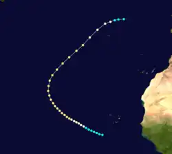 The official track for this storm begins on August 20 to the southwest of the Cabo Verde Islands,[3] similar to the paths created by Charles Mitchell in 1924 and C. J. Neumann in 1993. Although very little information could be found in relation to the storm,[34] it moved west-northwestward and is estimated to have intensified into a hurricane on August 22. By the following day, the system strengthened into a Category 2 hurricane with winds of 100 mph (155 km/h). Turning northeastward on August 26, the hurricane crossed the Azores, moving near Faial Island. The cyclone weakened to a tropical storm early on August 29 and was last noted northeast of the Azores several hours later.[3]