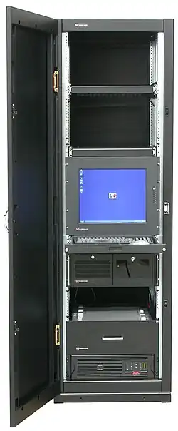 Nineteen-inch racks in two-post or four-post form hold most equipment in enterprise data centers, ISP facilities, and professionally designed corporate server rooms, although hyperscale computing typically use wider racks.[8][9] They allow for dense hardware configurations without occupying excessive floor space or requiring shelving.