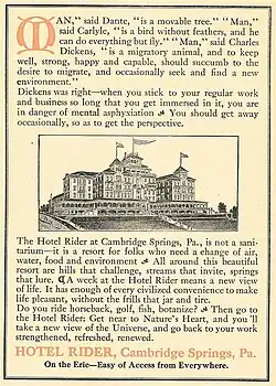 1. ^ Crisman, Sharon (2003). Around Cambridge Springs. Arcadia Publishing. pp. 30–35. ISBN 978-0738513270.