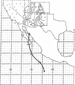 A tropical cyclone developed in the eastern Pacific Ocean on October 1, southwest of Mexico, at roughly 11.5ºN 104ºW. It moved northwestward, eventually making landfall along the western Baja California peninsula on October 4, just west of La Paz. It crossed the peninsula and weakened before emerging into the Gulf of California. Later, the storm moved ashore Sonora in northwestern Mexico with hurricane-force winds that lasted for several hours. The storm was drawn northward by a shortwave trough over Nevada. The hurricane's remnant low moved across the southwestern United States through Arizona, near the Four Corners region, and into Colorado, where it dropped heavy rainfall. The low later moved into Iowa.[1]: 25 [2][3]