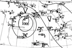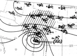 On June 7, ships in the Gulf of Mexico reported a low pressure area with a closed circulation about 100 mi (160 km) southeast of Port Eads, Louisiana.[4] Initially, the storm moved slowly southeastward, before turning west-southwestward late on June 8. Strengthening slightly, the cyclone turned to the northwest by June 11.[5] Around 12:00 UTC on the following day, a ship observed a barometric pressure of 995 mbar (29.4 inHg), the lowest known in relation to the storm. Based on this, maximum sustained winds were estimated at 70 mph (110 km/h).[4] Early on June 13, the storm curved northeastward and made landfall near Franklin, Louisiana, around 05:00 UTC. The system slowly weakened and emerged into the Atlantic Ocean from the Outer Banks of North Carolina, while still at tropical storm intensity. By 12:00 UTC on June 16, the cyclone weakened to a tropical depression. About 24 hours later, the depression dissipated about 150 mi (240 km) north of Bermuda.[5]