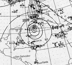The minimum atmospheric pressure of 928 mbar (27.4 inHg) established the cyclone as the third most intense landfalling Cuban hurricane. Deeper pressures of 921 and 915 mbar (27.2 and 27.0 inHg) were measured in the 1924 and 1932 hurricanes, respectively.[4] The cyclone (949 mbar, 28.0 inHg) was also the most intense tropical cyclone in the Florida Panhandle until Hurricane Opal (942 mbar, 27.8 inHg). At the time, it was tied with an 1882 storm, which also had a central pressure of 949 mbar (28.0 inHg) at landfall in northwest Florida.[5]