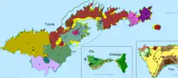 The Samoan Islands are composed of linear chains of volcanic islands placed on the top of the Pacific plate. The Pacific plate slightly moves west-northwest at a slow speed, causing old and active volcanoes under the surface. The youngest and most active volcano is named Vailuluʻu, with a volcanic cone just about 300 metres (330 yd) off the crater of Vailulu'u. Other than volcanos, there are multiple volcanic islands situated west of Vailulu'u.[5] The geology of Samoa consists of mafic material, like basalt and gabbro because of volcanic hotspots.[6]