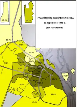 5. ^ Velychenko, Stephen (2019-11-04). Propaganda in Revolutionary Ukraine: Leaflets, Pamphlets, and Cartoons, 1917–1922. University of Toronto Press. p. 40. ISBN 978-1-4875-3070-9 – via Google Books. A 1919 Kyiv city census indicated that 20 per cent of the 544,369 counted could read and write in two languages and that 46 per cent could read and write in one language.