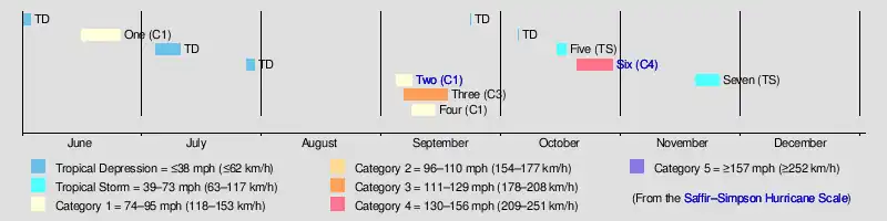 In addition to the seven tropical storms, five other systems formed but failed to reach tropical storm intensity. The first such cyclone developed over the northwestern Caribbean on June 1. Moving quickly northeastward, the depression crossed Cuba and the Bahamas before reaching the western Atlantic. The depression became extratropical by June 3.[3] On July 5, a tropical depression formed in the northeastern Gulf of Mexico. Tracking to the west, the depression degenerated into a trough while offshore Louisiana on July 8. That day, 5-minute sustained wind speeds of 39 and 40 mph (63 and 64 km/h) were observed in Galveston and Corpus Christi in Texas, respectively. The depression regained a closed circulation by July 10, shortly before making landfall near Galveston. By July 11, the system dissipated over northern Texas.[4]