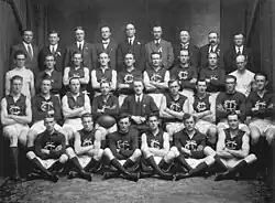 In 1921, the VFL competition consisted of nine teams of 18 on-the-field players each, with no "reserves", although any of the 18 players who had left the playing field for any reason could later resume their place on the field at any time during the match.