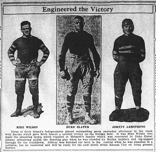 - ^ Art Williams, "Independents Slip Over Win at Racine, 6–3: Armstrong in Great Dash to Score After Slater Gets Fumble," Rock Island Argus, Nov. 10, 1924, p. 12.