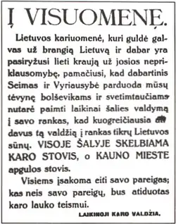 A pamphlet distributed in Kaunas following the coup declared martial law and commanded everyone to go about their daily duties. It was signed by the Temporary War Government.