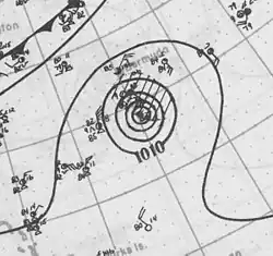 According to the Atlantic hurricane database, a trough situated more than 1,200 mi (1,930 km) east of the Leeward Islands developed into a tropical depression around 12:00 UTC on July 29.[1][2] The cyclone initially moved west-northwestward and strengthened, becoming a tropical storm by 00:00 UTC on July 31. On August 1, the cyclone turned northwestward and began strengthening rapidly.[2] Based on ship reports of hurricane force and near-hurricane-force winds,[1] it estimated the storm intensified into a Category 1 hurricane by 18:00 UTC. Early on August 2, the system intensified into a Category 2 hurricane. At 12:00 UTC, the cyclone became a major hurricane—with winds of at least 115 mph (185 km/h)—equivalent to Category 3 intensity on the modern-day Saffir–Simpson scale.[2] Around that time, a ship recorded a barometric pressure of 968 mbar (28.6 inHg) – the lowest known pressure in association with the storm. However, no ships entered the eye of the hurricane and sampled the lowest pressure in the storm.[1]
