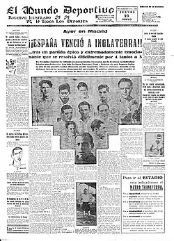 - ^ "¡España venció a Inglaterra!" [Spain beat England!]. Mundo Deportivo (in Spanish). Barcelona: Grupo Godó. 16 May 1929. p. 1. Retrieved 8 July 2021.