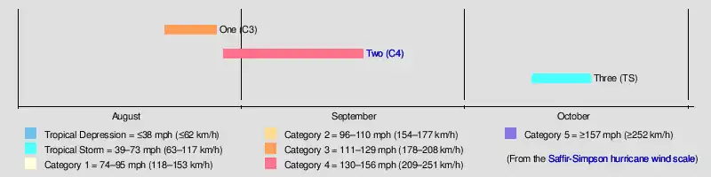 The 1930 Atlantic hurricane season was a very inactive Atlantic hurricane season. It was the second least active on record in terms of tropical storms forming, only behind 1914, with only three systems reaching tropical storm intensity. Of those three, two reached hurricane status, both of which also became major hurricanes, Category 3 or higher storms on the Saffir–Simpson hurricane wind scale.[1] The first system developed in the central Atlantic Ocean on August 21. Later that month, a second storm, the Dominican Republic hurricane, formed on August 29. It peaked as a Category 4 hurricane with winds of 155 mph (250 km/h). The third and final storm dissipated on October 21.
