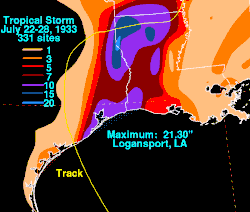 - ^ a b c R.A. Dyke (July 1933). "Excessive Rainfall of July 22–25, 1933, in Louisiana and Extreme Eastern Texas" (PDF). Monthly Weather Review. 61 (7). National Oceanic and Atmospheric Administration: 202–203. Bibcode:1933MWRv...61..202D. doi:10.1175/1520-0493(1933)61<202:erojil>2.0.co;2. Retrieved June 16, 2012.
